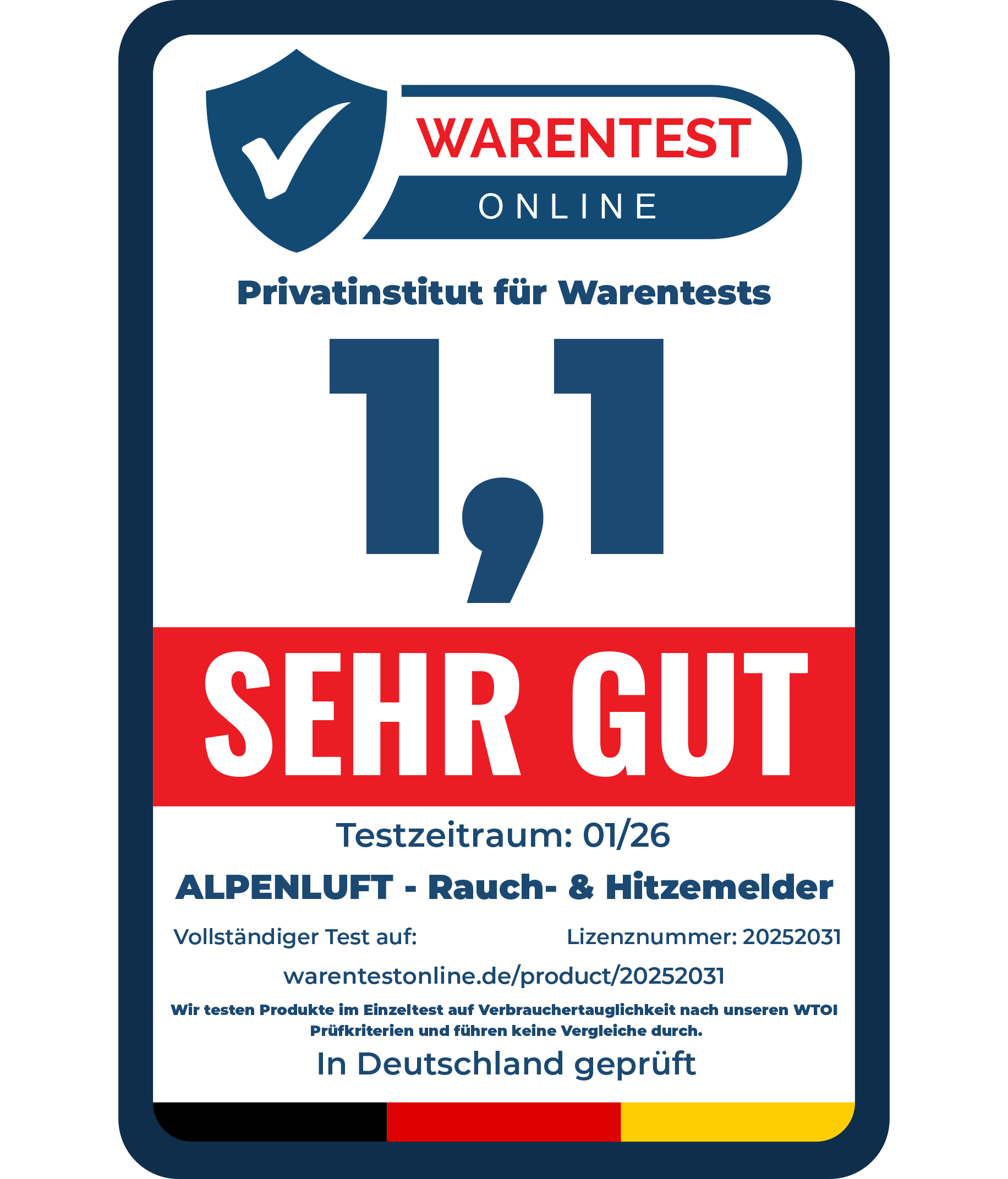 ALPENLUFT Rauchmelder erhielten die Bestnote "Sehr gut" beim unabhängigen deutschen Warenprüfer WARENTEST ONLINE.